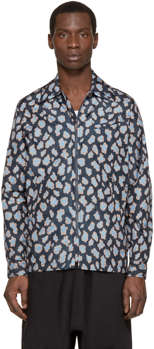 Long sleeve nylon jacket featuring pattern in navy, pale blue, and beige